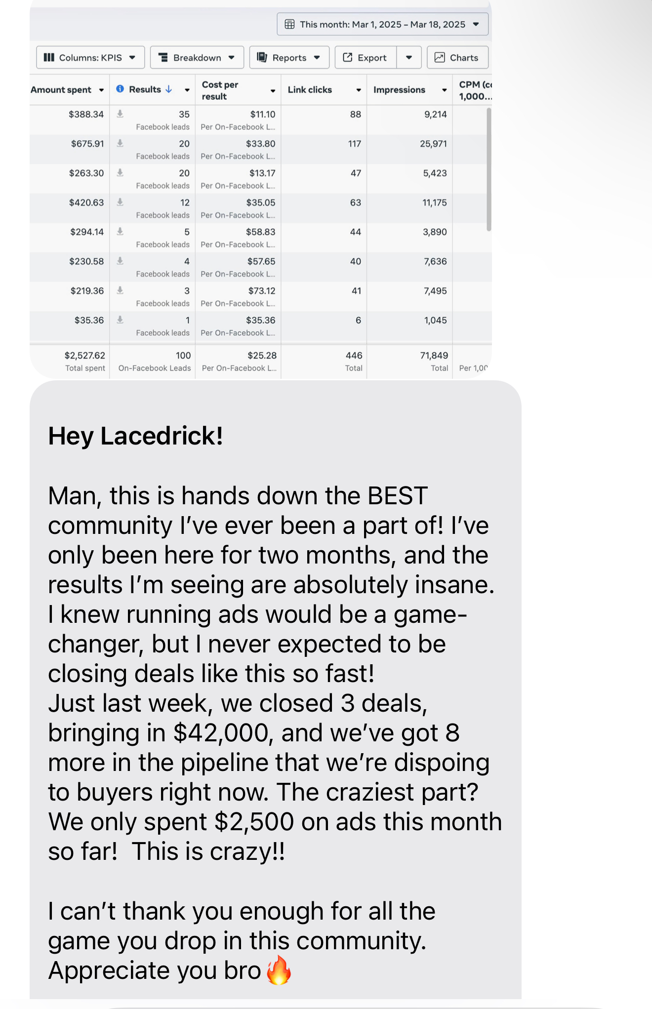 Now, after consistently closing multiple 5-figure deals each month, he teaches the exact strategies he used to scale fast: simple paid ads, sales psychology, and plug-and-play systems that work even while you sleep. Whether he’s building marketing machines for investors or coaching a community of action-takers, Lacedrick is obsessed with one thing—helping people build real, scalable businesses that create both freedom and consistent cash flow.